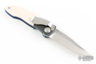 The 690-01 Elishewitz is a discontinued linerlock folder by Benchmade. It features a clip point satin finished blade with carbon fiber dovetailed bolsters, ivory paper micarta scales, and anodized titanium liners, tip down stainless steel clip. Comes with original clam shell box and papers. Excellent condition.
