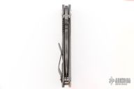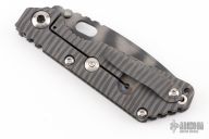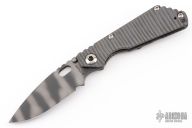 This Mick Strider Performance Series SNG CC framelock folder features a black drop point blade with thumbhole and notched thumbrest. The handle has a contoured and flamed titanium frame with titanium clip, tip up carry. Jimping on blade spine. Includes Hinderer "Lock Bar Stabilizer" for maximum reverse lock retention. Nice detent, lockup and blade seating. Excellent condition.