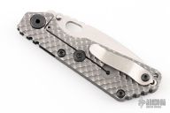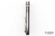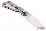 This SNG DGG by M Strider has a stonewashed blade with dual thumb studs, thumbhole, and notched thumbrest. Handle is black G-10 and bead blasted titanium "Gunner Grip", lockbar stabilizer, and titanium tip up clip. Nice detent, lockup and blade seating. Excellent condition.