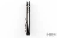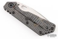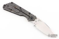 This SMF framelock folder by Mick Strider features a stonewashed drop point blade with a notched thumbrest.  The handle features a textured G-10 scale and a flamed titanium lockside with a matching tip up pocket clip. Comes in a zipper case. Excellent condition.
