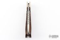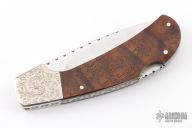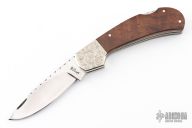 This lockback by Dick Dorough features a high polished drop point blade with a nail nick. The handle has engraved dovetailed nickel silver bolsters, wood scales, nickel silver liners and stainless backspacer. Nice lockup and blade seating. Has some light scratches, excellent condition otherwise.