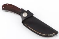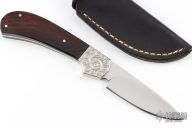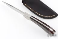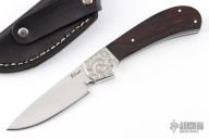 This skinner by Dick Dorough features a mirror polished drop point blade with .117" bladestock and .925" blade depth. Scales are wood with nickel silver engraved dovetail bolsters. Full tang construction with nickel silver pins. Comes with a leather belt sheath. Has a couple light scuffs and scratches, otherwise excellent condition.