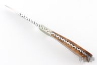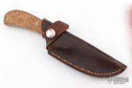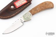 This skinner by Dick Dorough features a mirror polished drop point blade with file worked blade spine,.129" bladestock and .960" blade depth. Scales are wood with nickel silver engraved dovetail bolsters. Full tang construction with nickel silver pins. Comes with a leather belt sheath. Has a couple light scuffs and scratches, otherwise excellent condition.