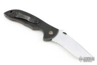 Here's a piece of history - a third year Emerson Commander. Emerson Knives was formed in 1998 and the Commander evolved from Ernie's SpecWar work on the ES1 for the military. "The Emerson Commander is the winner of the "Best Overall Knife of the Year" at the International Blade Show in Atlanta, GA. The Blade Show is the world's largest cutlery showcase and is the cutlery industry's premier event. This award is judged by fellow manufacturers and is the highest honor and most sought after award in the cutlery industry." "The Emerson Commander is a 21st century combination of design, materials, performance, and razor sharpness. This knife along with other Emerson Knives, sets the new standard for the cutlery industry and continues to push the design and performance envelope for cutting tools well into the 21st century." "The Commander knife-battle tested and proven-incorporates some of the most advanced ergonomics ever featured on a folding knife. The knife, already in use with elite armed forces, European Military strike teams and NATO Counter-Terrorist units throughout the world was chosen by the U.S. Navy SEAL teams for issue to special units within the Naval Special Forces Units. Because of its ruggedness, it has become a favorite of hunters, outdoors men and adventurers the world over. It features the patented "wave shaped opening feature" with Dragon's Teeth™ serrations." This production Commander linerlock folder has a recurved blade and G10 handle with titanium liners. Wave feature was first used on the Commander. Dated 2000. Comes with original box and papers. Has a couple of light scuffs on the blade, otherwise excellent condition.