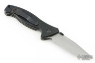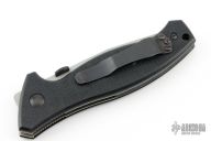 This Specwar by Emerson Knives has a bead blasted clip point partially serrated blade with a thumbdisc. The handle has textured black G-10 scales, titanium liners, black backspacer and a tip up black stainless steel clip. Dated 1998. Excellent condition. Comes with original box and papers.