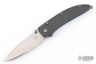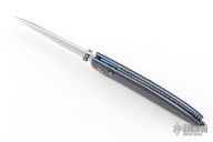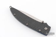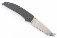 This gents folder features the unique Nak-Lok that uses tensile strength rather than compression to lock the blade. Bolster button releases blade. Carbon fiber scales with anodized titanium liners, stainless steel backspacer. Comes with leather pocket sheath. Excellent condition.