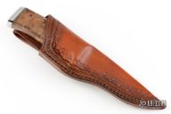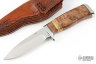This hunter by George Cousino features a mirror polished blade with .155" blade thickness and 1.041" blade depth, hidden tang construction. The handle has a stainless steel guard and butt, burl wood grip with black/stainless steel spacers. Comes with a hand tooled brown leather sheath. #1262 on blade. Excellent condition.