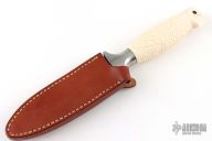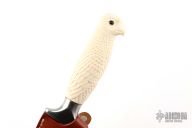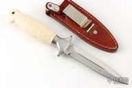This Trooper by Kershaw Knives is a mirror polished double edged dagger with fullers, .207" blade stock and .921" blade depth, hidden tang construction. The handle has a stainless steel guard, carved mammoth ivory grip with a brass spacer. S/N 6/100. Excellent condition. Comes with original brown leather sheath. Note: Erhard W. Gross was hired by Kershaw to make a limited edition of ivory carved handles for the Trooper in the mid 1980s. The handles were animal themes and included an Eagle, Grizzly Bear, Bighorn Sheep, and Polar Bear.