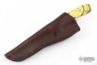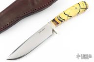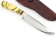 This drop point hunter by Phillip M Parris features a satin finished convex ground blade with .181" blade stock and 1.224" blade depth, full tapered tang construction. The handle has a nickel silver guard, stabilized cross-cut mammoth ivory scales with mosaic pins and yellow liners. Comes with a leather sheath. Has some scratches on the guard, otherwise excellent condition.