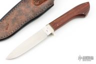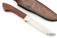 This knife by David Shaw features a hand rub satin finished drop point blade, .193" blade stock and .836" blade depth, hidden tang construction. The handle has a nickel silver guard, cocobolo grip with black/white spacers. Comes with a brown leather sheath with belt loop. Excellent condition.