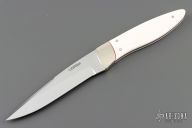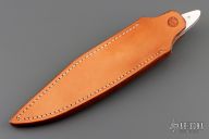 This boot knife by Harold Corby features a mirror polished blade with a false top edge, .084" blade stock and .825" blade depth, full tang construction. The handle has nickel silver dovetailed bolsters, mammoth ivory scales with red liners. Comes with a brown leather boot sheath. Excellent condition.