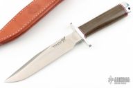 This Model 1-7 by Blackjack Knives features a satin finished blade with false top edge, .219" thick and 1.204" deep, hidden tang construction. Double aluminum guard, green canvas micarta grip with black/red/white spacers and an aluminum butt. Comes with brown leather sheath and original box. Excellent Condition.