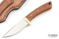 This knife by D'Alton Holder features a satin finished blade with .111" blade stock and .907" blade depth, full tang construction. The handle has a brass guard, brown linen micarta scales with brass pins. Comes with a hand tooled brown leather sheath with belt loop, I don't think it is original to the knife, but it fits. Has some scratches and pitting on the blade, otherwise good condition.