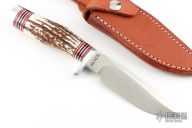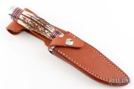 This Classic Blades Woodsman from Blackjack Knives features a drop point satin finished blade with .214" blade stock and 1.26" blade depth, hidden tang construction. The handle has an aluminum guard with red white and black spacers, stag handle, aluminum pommel and stainless steel pommel nut. Lanyard hole in pommel. Includes leather sheath with belt loop. Has a few light scratches and some light patina, otherwise excellent condition.