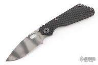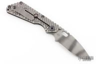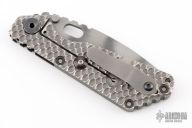 This SNG DGG by Strider has a stonewash spear point blade with dual thumb studs, thumb hole, and notched thumb rest. Handle is green G-10 and bead blasted titanium "Gunner Grip", lockbar stabilizer, and anodized titanium tip up clip. Nice detent, lockup and blade seating. Has scuffs and scratches, great condition otherwise.