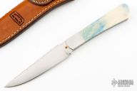 This Boot Knife by Alan S Hodges features a hand rub satin finished blade with fileworked spine, .132" blade stock and .917" blade depth, full tang construction, fully fileworked tang. The handle has stainless steel bolsters, dyed bone scales with blue liners and nickel silver pins. Comes with a custom hand tooled brown leather sheath by Harvey King. Has a couple light scratches, otherwise excellent condition.