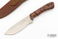 This Skinner by Todd Allan features a drop point satin finished blade with notched thumbrest and fileworked spine, .193" blade stock and 1.478" blade depth, full tang construction. The handle has curly wood scales with mosaic pin. Comes with a brown leather sheath, not original to the knife, but it fits. Excellent condition.