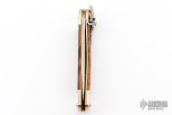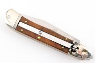 This leverlock auto by Hubertus features a tumble polished blade. The handle has nickel silver double bolsters, wood scales, nickel silver liners and brass pins. Has scuffs and scratches, great condition otherwise.