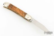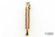 This leverlock auto by Hubertus features a tumble polished blade. The handle has nickel silver double bolsters, wood scales, nickel silver liners and brass pins. Has scuffs and scratches, great condition otherwise.