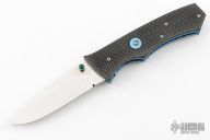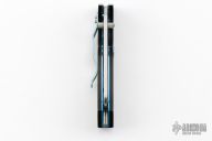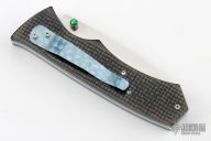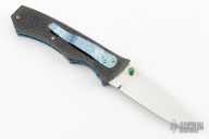 This D/A auto by Nate Clark features a mirror polish drop point blade with thumbstud with knurling and inset. The handle has carbon fiber, polished and anodize finish titanium liners with jeweled interiors, mirror polished stainless steel backspacer, titanium button with inlaid abalone. Nice action, lockup, detent and blade seating. Comes in a zipper case. Excellent condition.