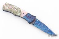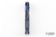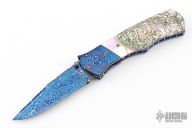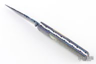 This D/A Scale Release auto from Steve Busch features a blued Damascus blade with file worked spine, it has a thumbstud. The handle has blued damascus bolsters, abalone scales over fileworked and anodized titanium liners, fileworked stainless steel backspacer. Nice action, lockup and blade seating. Comes in a zipper case. Has some scratches, otherwise excellent condition.