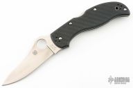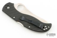 This Stretch Lockback Folder from Spyderco has a satin finished blade with thumb hole and notched thumb rest. The handle has carbon fiber scales with stainless steel liners and stainless steel 4-way reversible clip. Comes with original box and papers. Excellent condition.