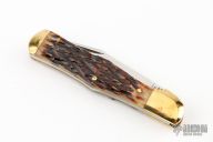 This slipjoint by Parker Cutlery Company has a satin finished blade with nail nick. The handle has brass bolsters, jigged bone scales, brass liners, stainless steel backspacer. Has some light scratches, otherwise excellent condition. Comes with original box.