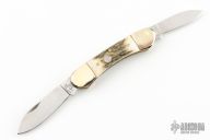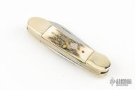 This slipjoint by Crazy Horse Knives features mirror polished blades with nail nicks. The handle has nickel silver bolsters, stag scales, brass liners and stainless steel springs. Comes with original box. Excellent condition.