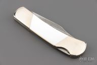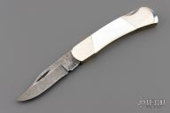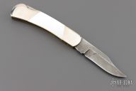 This Lockback by Bear and Son feature a Damascus blades with nail nicks. The handle has nickel silver bolsters, mother of pearl covers, brass liners and steel spring. Comes with original box. Has some scratches, otherwise good condition.