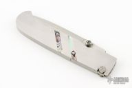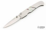This Toggle Lock folder by Rigid features a satin finished blade with a single thumbstud. The handle has a stainless steel frame with abalone inlays and a stainless steel backspacer. Comes with original box. Has a couple scratches, otherwise excellent condition.