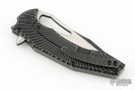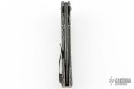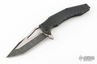 This SF Knife was deigned by Michael Gavac and made by Custom Knife Factory.  This knife features harpoon style blade with dark tumbled grinds and satin finished flats. The handle features a dark tumbled titanium frame with a matching tip up pocket clip. Excellent condition.