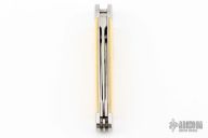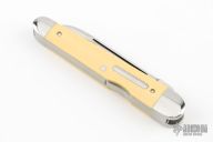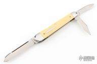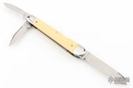 This Lockback Whittler by Bill Ruple features a large single blade that is engaged by the lockback. The remaining two blades are slipjoints, they both have halfstops and are flush in all positions. All blades are hand rub satin finished The handle has stainless steel bolsters with integral liners, Westinghouse ivory paper micarta covers, stainless steel escutcheon and springs. Has a couple light scratches, otherwise excellent condition.
