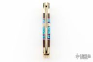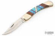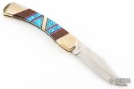 This Schrade Cutlery Uncle Henry knife is Customized by David Yellowhorse. It is a lock back with nickel silver bolsters, wood, turquoise, and aluminum spacers. Satin finished blade. Strong lock up. Has some light scuffs and scratches, excellent condition otherwise.