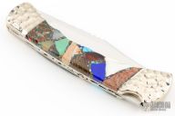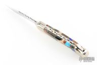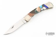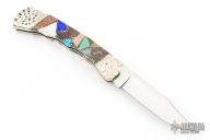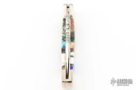 This Buck 110 has been Customized by Ghostown Knives. This one has a mirror polished blade with fileworked spine and a nail nick. The handle has a nickel silver frame with carved bolsters, and fileworked stainless steel backspacer. The inlay is a stone mosaic. Marked #367-16 on bolster. Has a few light scratches, otherwise excellent condition.