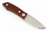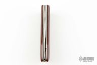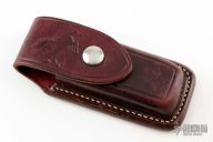 This Barry Wood design swing lock folder features a satin finish blade and satin finish stainless steel frame with maroon linen micarta scales. This is a very unique scissor opening folder, which when the blade is fully open and locked in place is almost a fixed blade knife. The handle is nicely contoured for a comfortable grip. Opening is accomplished by lighting pressing down and outward at the rear indentation on the spine, which releases the locking pin and allows one side of the handle and the blade to rotate down then forward until the blade locks in the forward position. The one side of the handle continues to rotate back until it locks in place. Closing requires the same slight thumb pressure at the indentation to release the locking pin, then the one side of the handle is rotated back and around, catching the blade and aligning both with the other side of the handle in a locked closed position. Perfect function. Comes with original box and brown leather sheath. Has some light scratches, otherwise excellent condition.