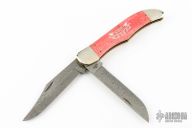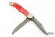 This slipjoint by Case features two Damascus blades with nail nicks. The handle has nickel silver bolsters, dyed bone covers, brass liners and stainless steel springs. Has some light scratches, otherwise excellent condition. Comes with original box and papers.