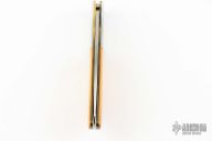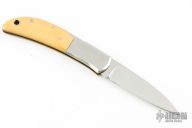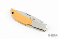 This knife by Al Mar features a mirror finished blade with nail nick. The handle has stainless steel bolsters, yellow paper micarta scales, brass liners, and a stainless steel backspacer. Has some light scratches, otherwise excellent condition. Comes with original box and brown leather slip sheath.