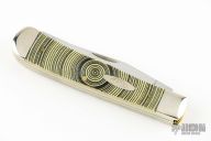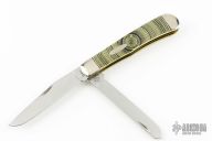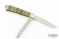 This Trapper by Case features 2 polished blades with nail nicks. The handle has nickel silver bolsters, yellow "Tree Ring" covers, with a nickel silver shield, brass liners and stainless springs. Excellent condition. Comes with Case box and papers.