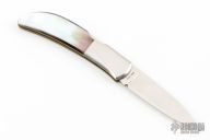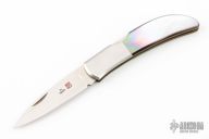 This knife features a satin finished blade with nail nick. The handle has stainless steel bolsters, black lip pearl scales, brass liners, and a stainless steel backspacer. Comes with original box. Has a few light scratches, otherwise excellent condition.