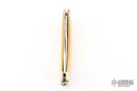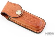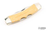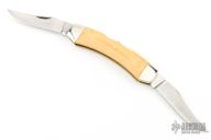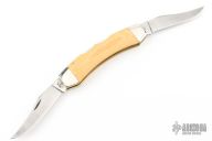 This Texas Lock Horn by Case Knives features two satin finished blades with nail nicks. The handle has nickel silver bolsters, yellow paper micarta scales, brass liners and stainless steel backspacers. Comes with original box, sheath and papers. Has a few light scratches, otherwise excellent condition.