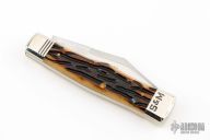 This slipjoint by Schatt and Morgan features a mirror polished blade with nail nick. The handle features nickel silver bolsters, brass liners and jigged bone covers. Stainless steel spring. Excellent condition. Comes with original box.