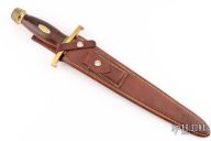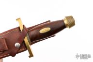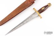 This Model 13-12 Arkansas Toothpick by Randall Made Knives features a satin finished carbon steel double edged blade with .207" blade stock and 1.593" blade depth, hidden tang construction. The handle has a lugged brass guard and scalloped butt, walnut grip with black and brass spacers, brass oval escutcheon with "W.E.M." engraved. Comes with a rough back brown leather sheath. Has some scratches and patina, otherwise good condition.