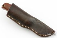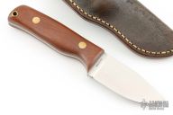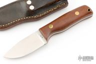 This hunter by Scott Gossman features a satin finished clip point blade with a full tang construction, .127" bade stock and 1.245" blade depth. The handle has wood scales with brown canvas micarta liners and brass pins. Includes leather sheath with belt loop. Excellent condition.