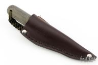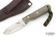 This Knife by Blind Horse Knives features a satin finished scandi ground blade with .124" blade stock and .950" blade depth, full tang construction. The handle has black canvas micarta scales.  Includes a brown sheath with belt loop. Knife has been used, has some light staining, otherwise good condition.