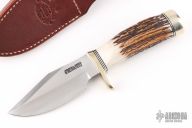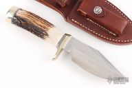 This Model 19-4 Bushmaster by Randall Made Knives features a satin finlsh clip point blade with sharpened top edge and notched thumbrest, .213" blade stock and 1.622" blade depth, hidden tang construction. The handle has a nickel silver guard and butt, black and duralumin spacers and a stag grip. Includes original leather sheath with belt loop. Has a few light scratches, otherwise excellent condition.