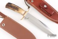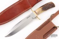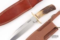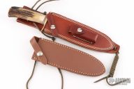 This Model 14 CDT by Randall Made Knives features a clip point satin finished blade with a sharpened top edge, .218" blade stock and 1.398" blade depth, hidden tang construction. The handle has a brass guard, stag grip, red/white/blue spacers. Cut Down hidden tang. This knife was designed to meet the demand for an almost indestructible all-purpose knife, though it is especially suited for combat and survival purposes. Comes with original brown leather sheath and a high ride brown leather sheath by Star. Has some small oxidation spots, otherwise good condition.