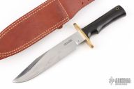 This Model 14 by Randall Made Knives features a satin finished blade with sharpened top edge, .213" blade stock. 1.396" blade depth, full tang construction. The handle has a brass guard, black linen micarta handle with a lanyard hole at the butt. This knife was designed to meet the demand for an almost indestructible all-purpose knife, though it is especially suited for combat and survival purposes. Comes with original brown leather sheath. This knife has some oxidation spots, the knife has been refinished to a degree to remove the oxidation, has been resharpened, otherwise good user condition.