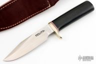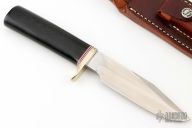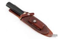 The Model 15 was designed especially for air crew survival and combat purposes in cooperation with U.S. Marine Corps Equipment Board. This knife has a satin finished blade with sharpened top edge and notched thumbrest, .204" blade stock and 1.275" blade depth, cut down tang (hidden tang). The handle has a nickel silver guard, black linen micarta grip, red/white/blue spacers, compass in the butt. Comes with original brown leather sheath. Excellent condition.