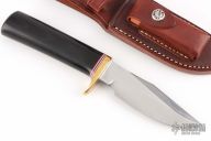 This Model 23 "Gamemaster" by Randall Made Knives features a satin finished clip point blade with sharpened top edge and a notched thumbrest, .196" blade stock and 1.298" blade depth hidden tang construction. The handle has a brass guard and a black linen micarta grip with red/white/blue spacers, compass in the butt. Comes with original brown leather sheath. Has some oxidation spots, otherwise good condition.