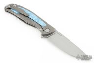 This F95NL framelock from Shirogorov features a flat ground tumble finished Chromax PM blade with notched flipper. The handle has a tumble finished titanium frame with yellow blue micarta inlay complimented by a matching tip up clip and a single titanium barrel spacer at the butt along with a lanyard hole. Excellent lockup, strong detent, and nice seating. Includes the original box and papers. Excellent condition.